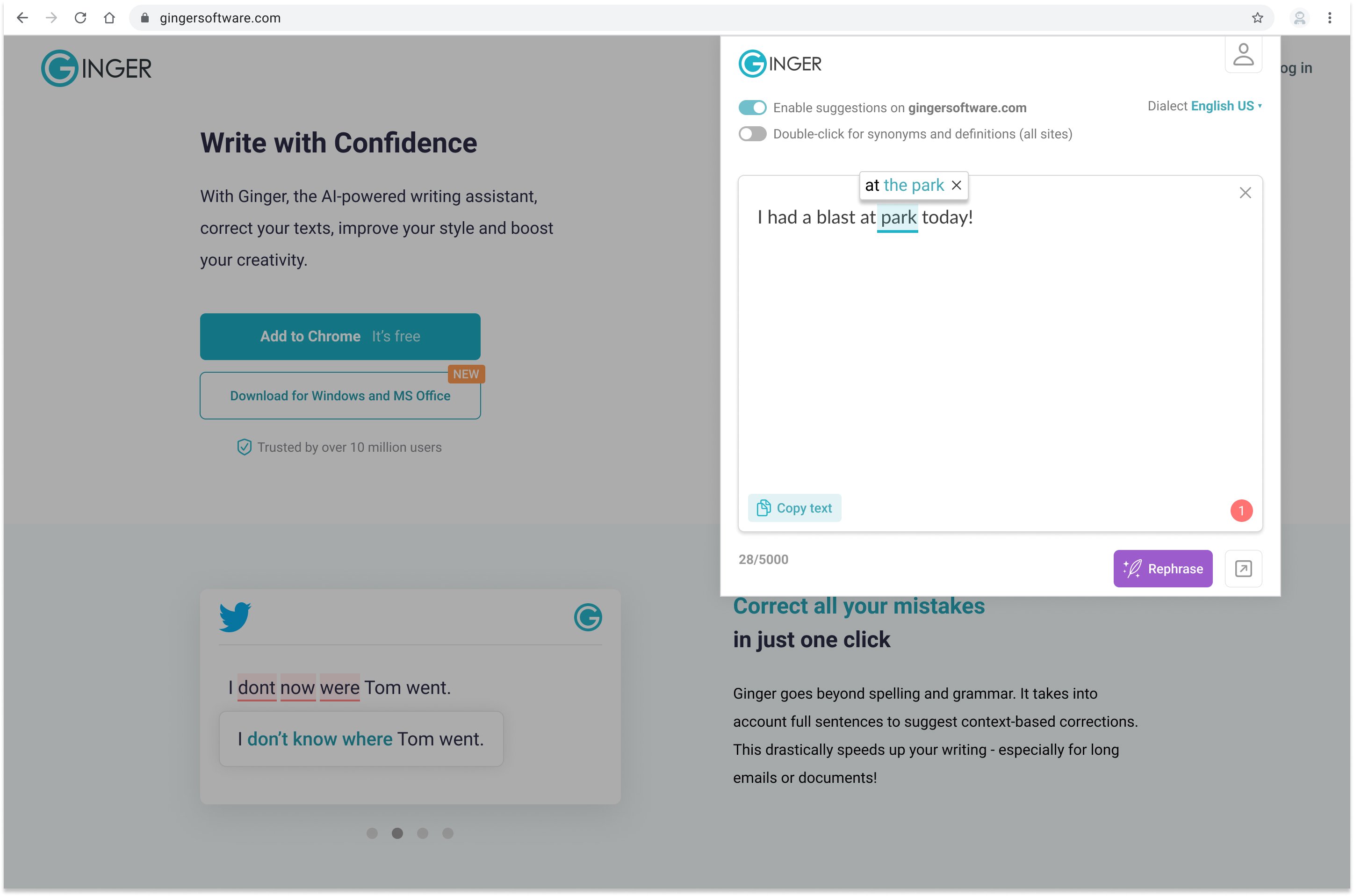 When you add our extension to your browser (available on Chrome, Edge), you can access Ginger’s writing suggestions for all your favorite websites such as Gmail, LinkedIn, Twitter, Facebook, and more.